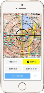 AEDの設置情報は、精度A(青色)、精度B(黄色)、精度C(赤色)、精度D(灰色)の4区分で表示されます。精度選択ボタンをタップすることによって各精度別に色分けされたピンを見る事ができます。